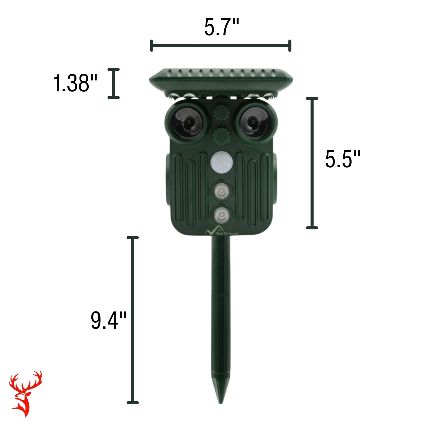Dimensions: 5.6" x 5" x 3.75" (unit), 12.6" stake height for secure installation.